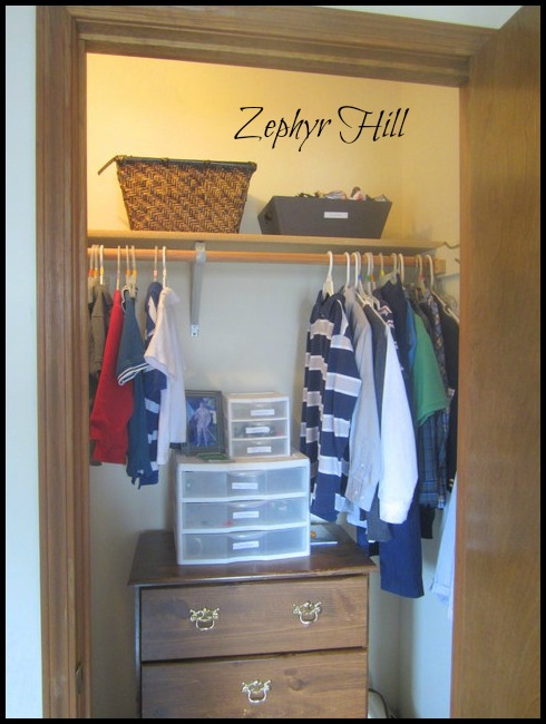 7. Re-work your closets. Our boys’ dressers are inside their closets, right under the hanging clothes. That’s two less pieces of furniture cluttering up their bedrooms. For baby clothes you can install a double set of rods in a closet since their clothes are small. You can also stick a bookshelf or stacking bins inside closets for added space. Buy over-the-door shoe organizers, hang them on the inside of your closets and use them to store art supplies, toys, scarves and mittens, etc. I’d rather have a full closet with a door or curtain you can close than a cluttered house any day.
