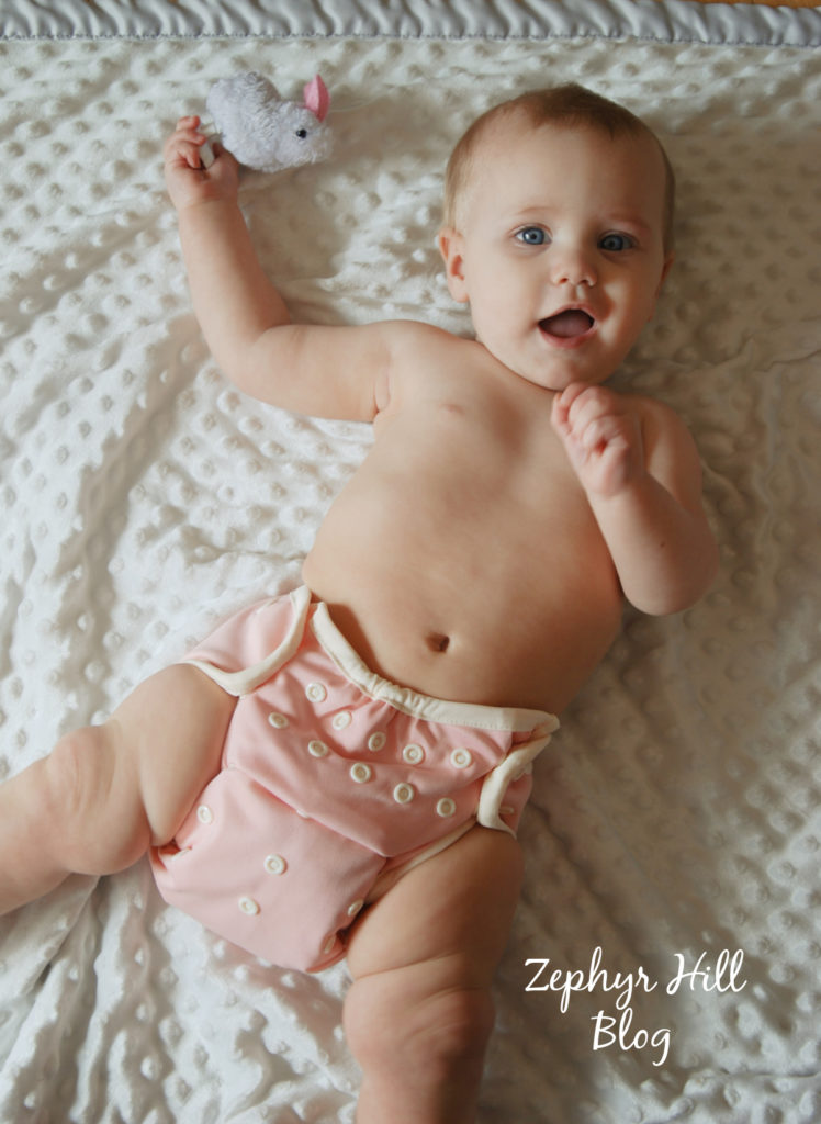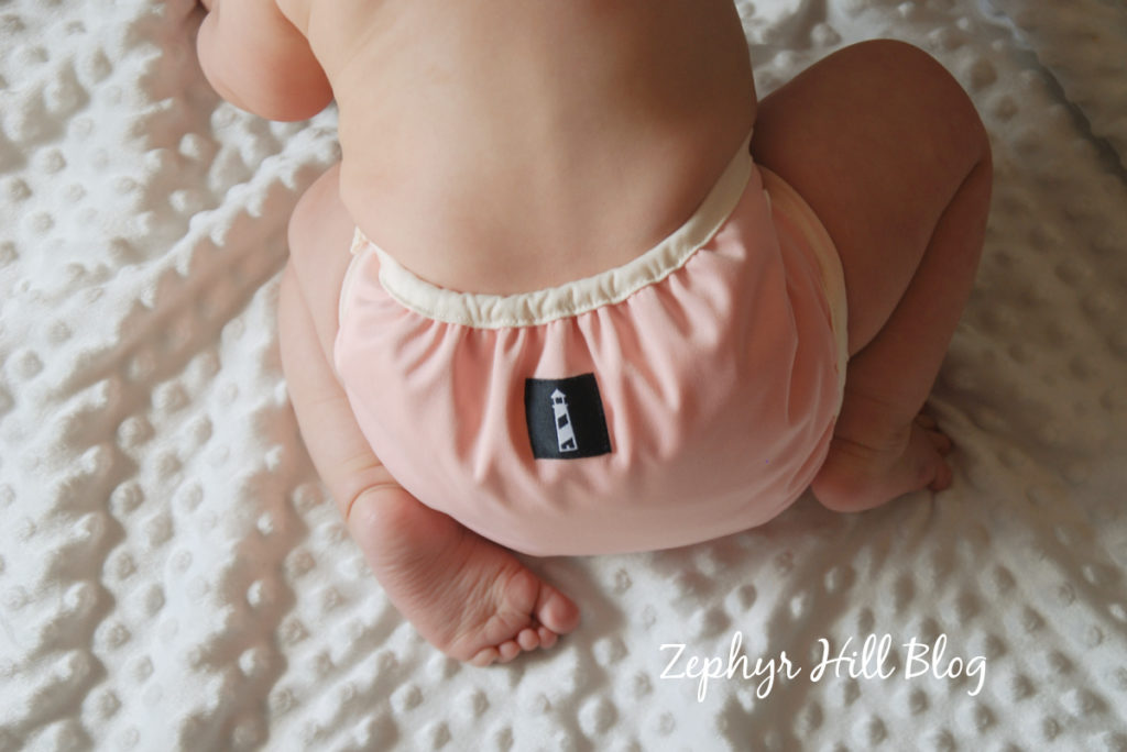 So if I want to use Lighthouse diapers as covers, I will opt for the SWIM diaper. They are made of the classic stretchy fabric, have the cool mesh lining and work splendidly with my prefolds and flats. They aren’t puckered at the middle and use the classic Lighthouse tabs (stretchier and more square).