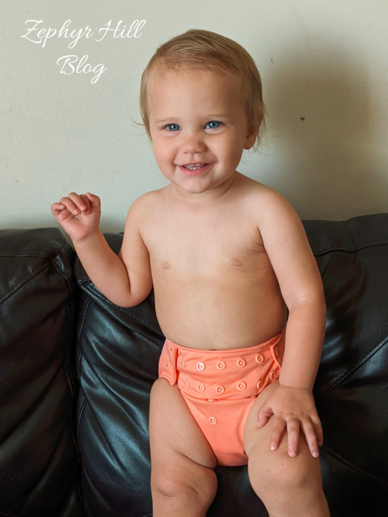 The bamboo pad attaches at the back of the diaper, and it stays attached during washing and drying. We’ve been really pleased with the softness and absorbency of this diaper; adding a small booster allows Lydia to even wear it at night. We picked the color Mango for her. Like the other Imagine/Nicki’s AIO’s we’ve looked at today, this one also has wing tabs that I wish were longer. Other than that, no complaints!