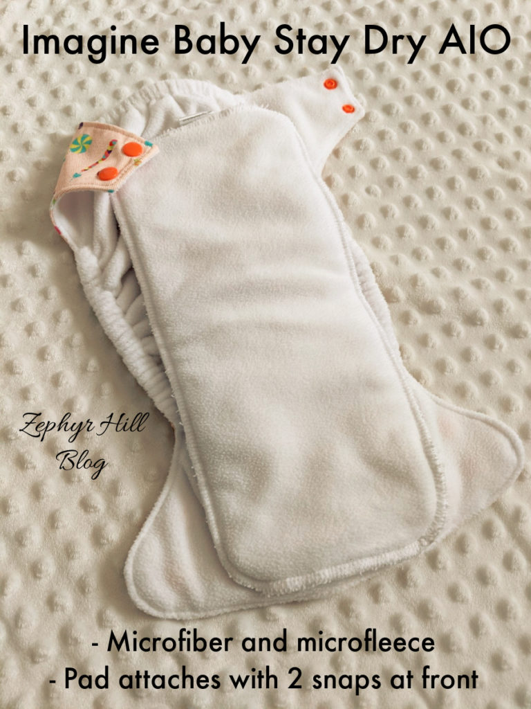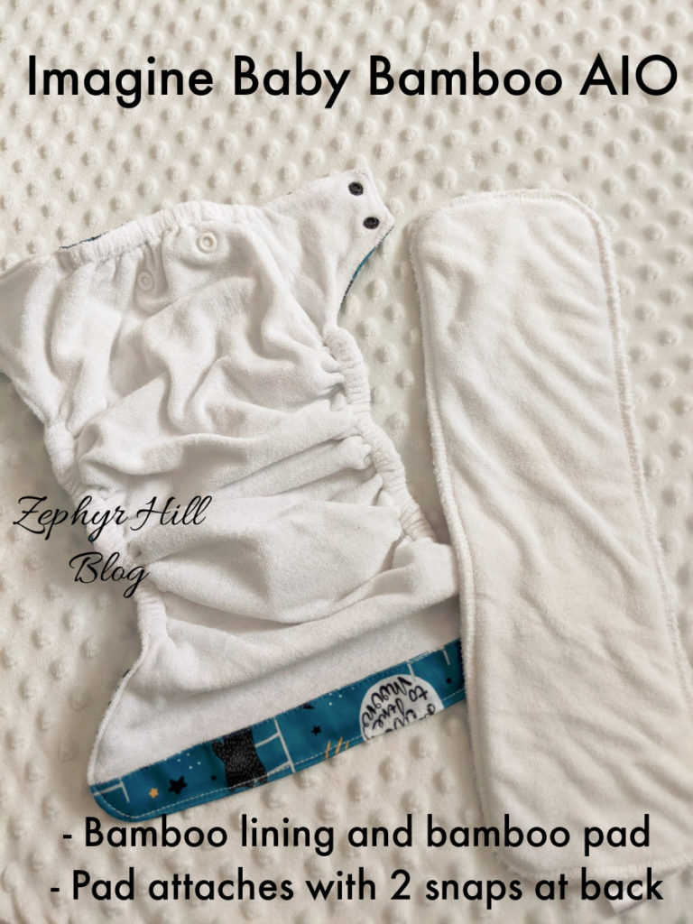 Imagine also has an AIO diaper made with super soft and silky bamboo. This highly absorbent fabric lines the inside of the diaper, and there’s a bamboo pad which snaps into the back part of the diaper. You can choose aplix (velcro) or snap closure for the outside of the diaper.
