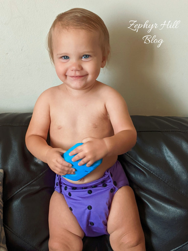 My affiliate, Nicki’s Diapers, sent us an assortment of their all-in-one diapers in prints and colors that are ideal for fall. Left to right: Mango, Sugar Rush, Violaceous and To the Moon